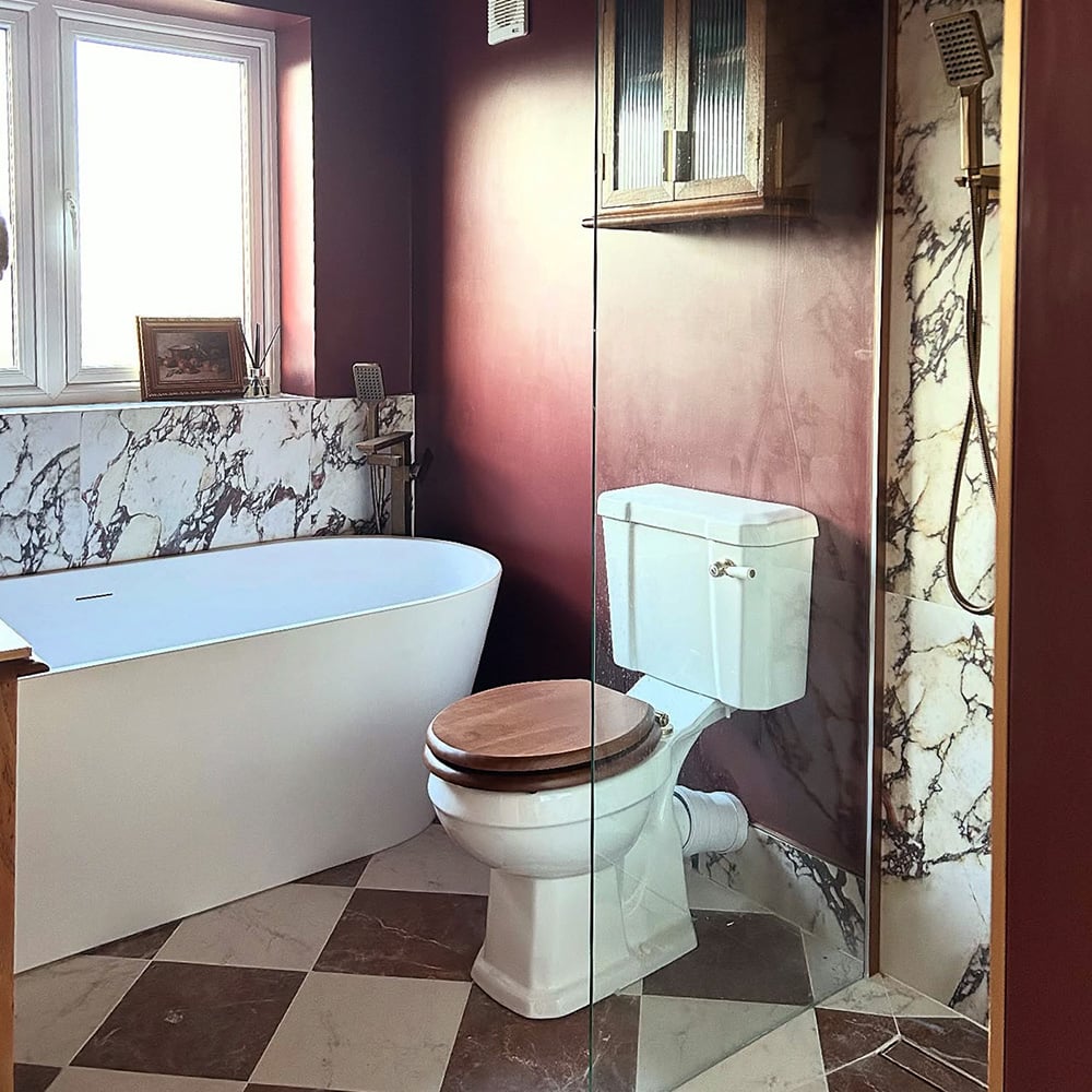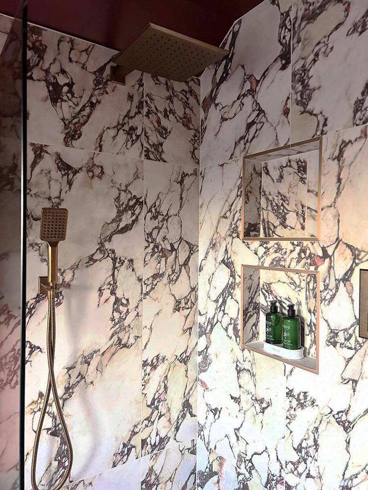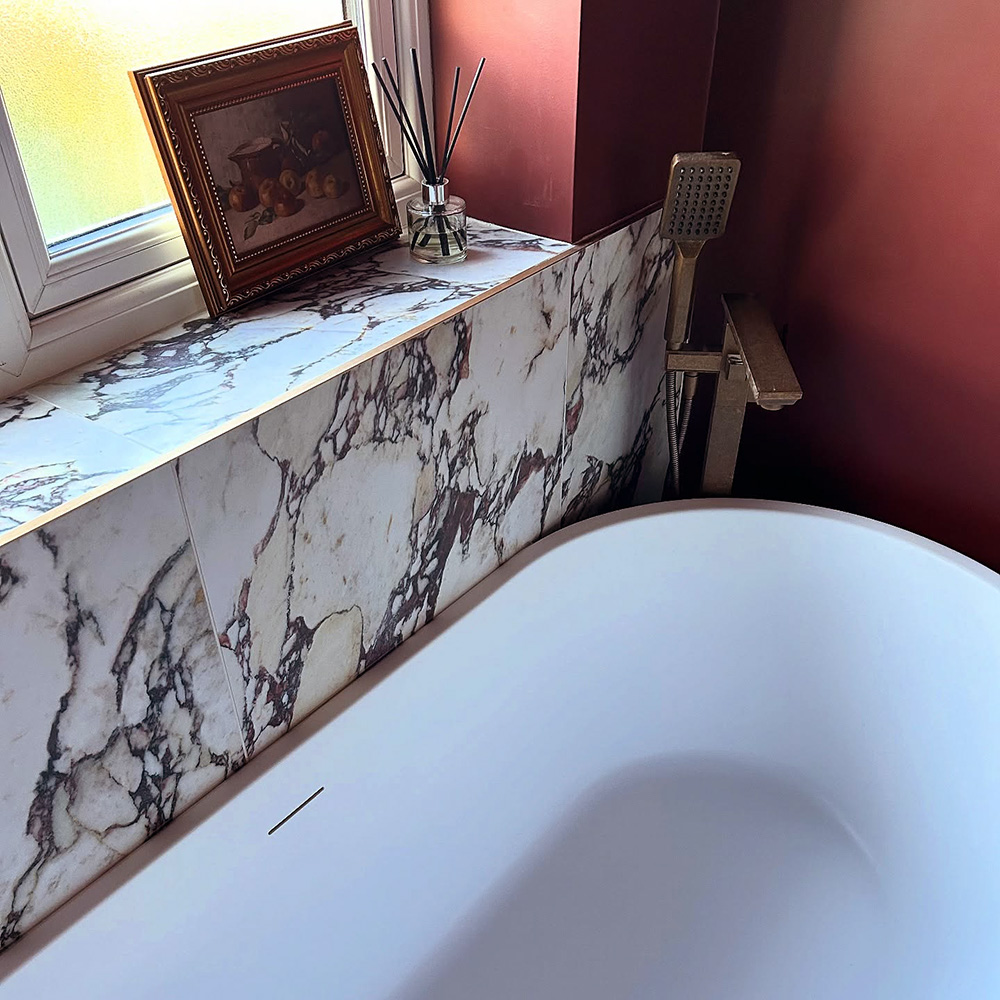 Bringing that key vision to life, Olivia chose the Calacatta Viola Nouveaux Matte Porcelain Tiles. The striking design and rich burgundy veining immediately sets the tone of the room, capturing a sense of drama while still maintaining that calm, luxurious atmosphere Olivia wanted to achieve.